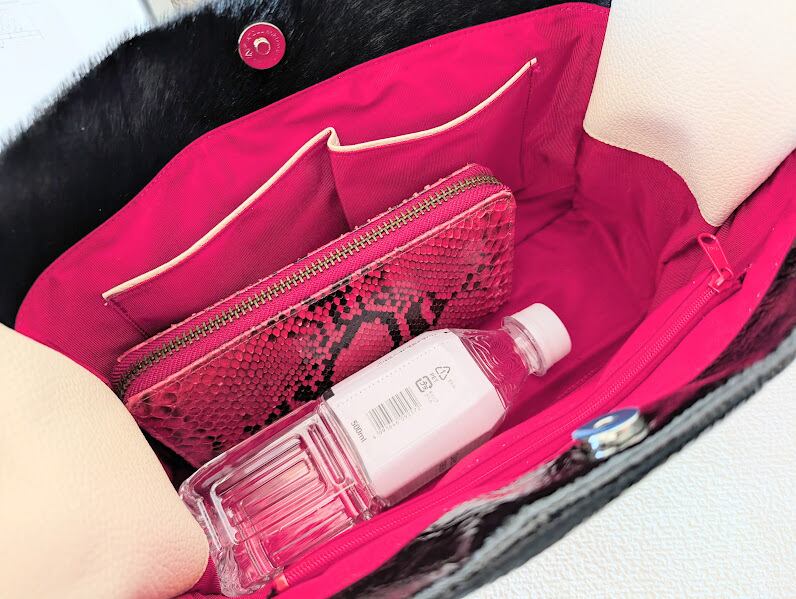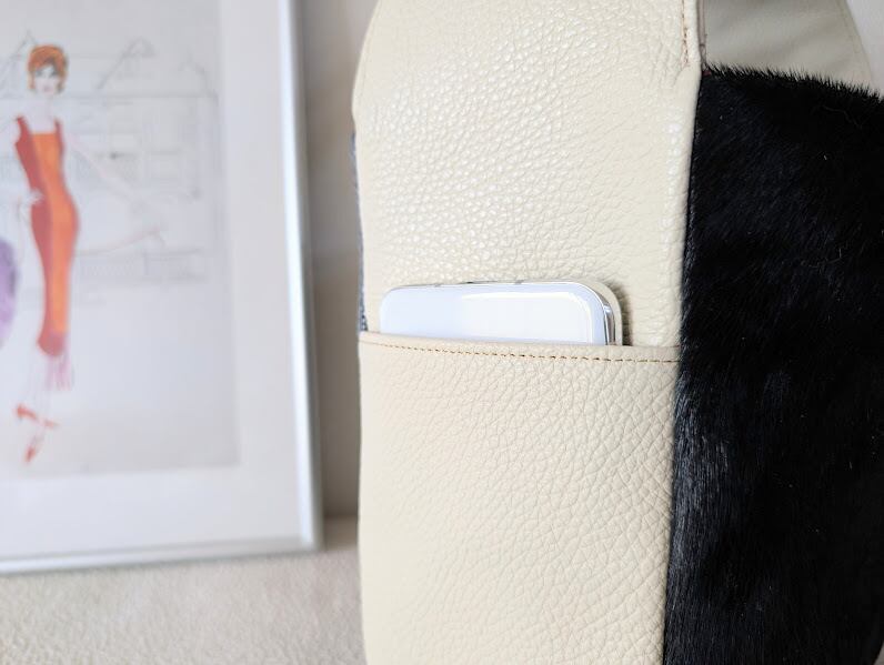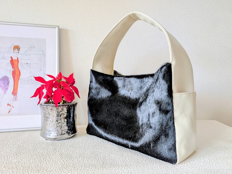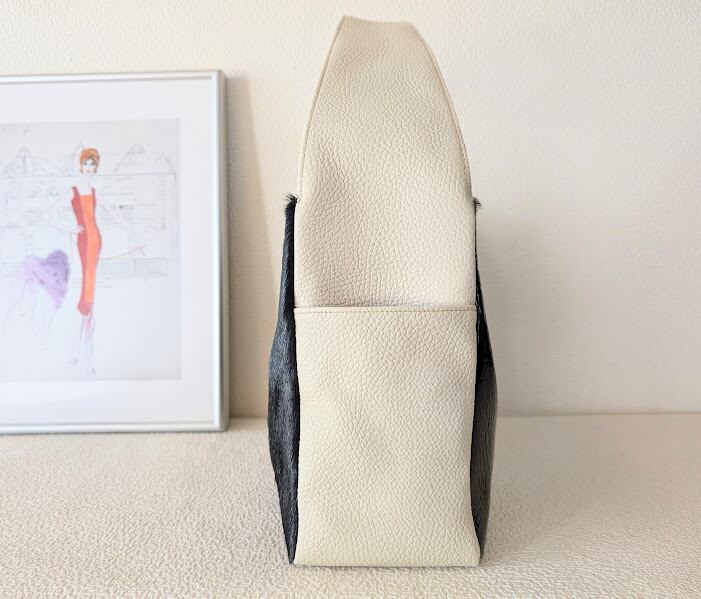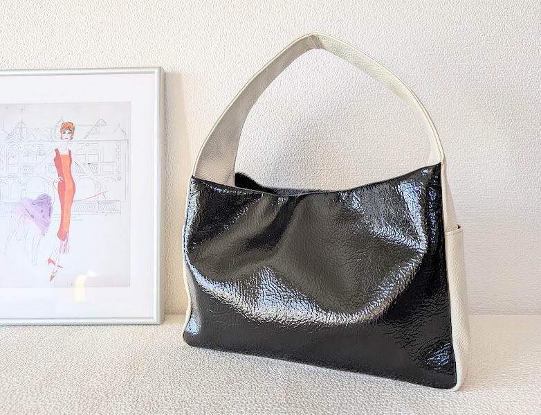 【オーダー】サイドポケットバッグL:黒×アイボリー【ハラコ×エナメル革】